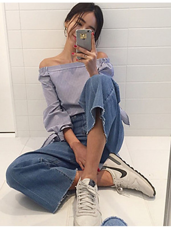 Women's Casual/Daily Sexy / Street chic Summer Blouse,Striped Boat Neck Long Sleeve Blue Cotton Thin